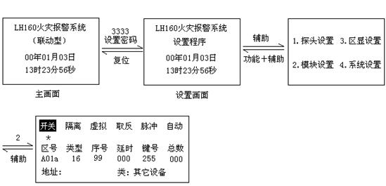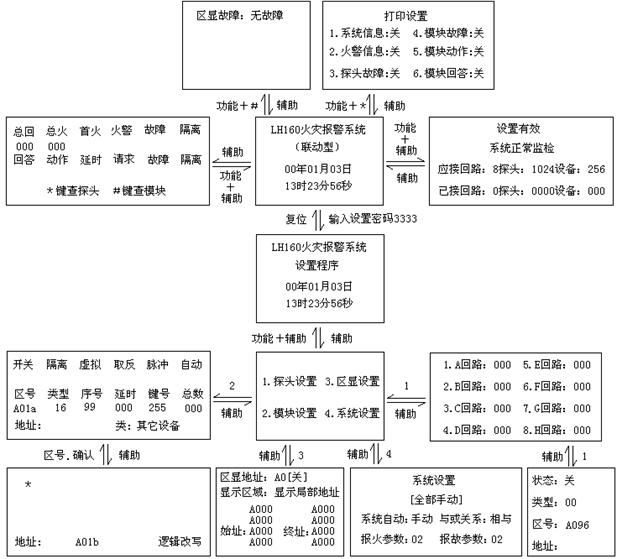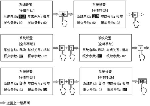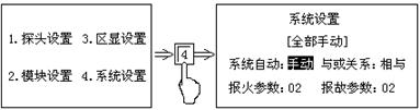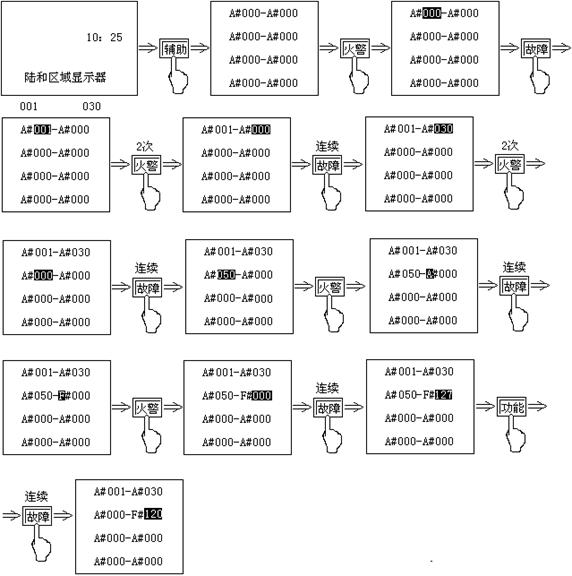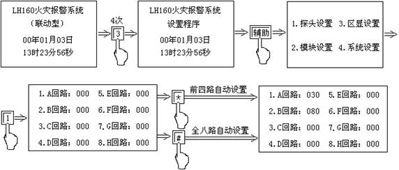 | 設(shè)置畫(huà)面 | “輔助”→“1” | ①選擇所要查詢的回路對(duì)應(yīng)的數(shù)字②功能+0查詢狀態(tài)③“▽”“△”查探頭的開(kāi)、關(guān)狀態(tài) | 復(fù)位 | |||