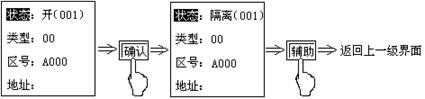 | 10 | 隔離 | 探測(cè) | 主畫(huà)面 | “3333” →“輔助”→“1” | ①“▽”“△”選擇要隔離的區(qū)號(hào)②移動(dòng)光標(biāo)至“狀態(tài)”③按“確認(rèn)”選擇“隔離狀態(tài)” | 輔助 |