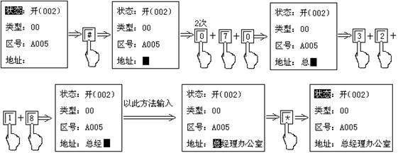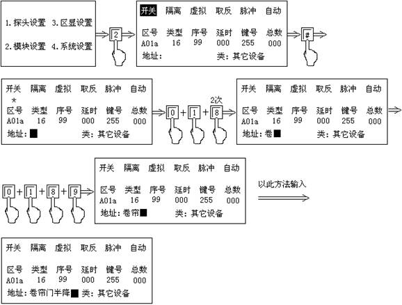 4.4)探測(cè)器與輸出模塊調(diào)試正常后,可依據(jù)需要輸入中文地址,具體操作詳見(jiàn)中文地址編制。