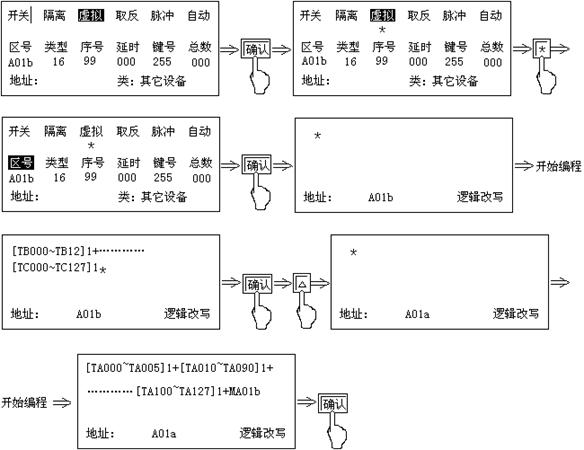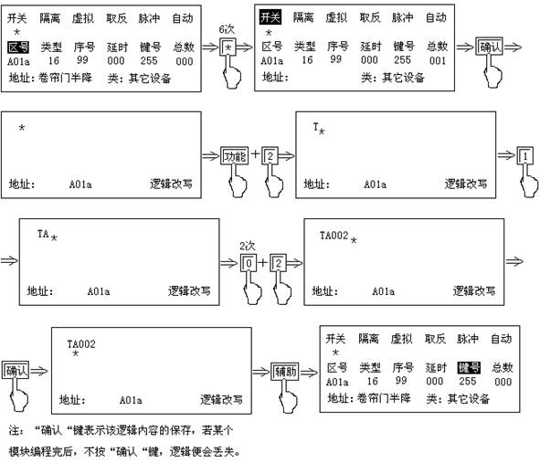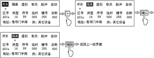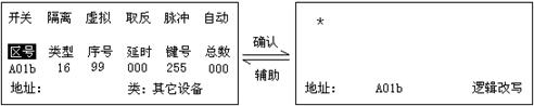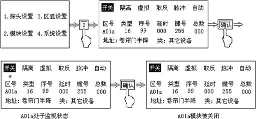注:設(shè)置畫(huà)面中的“開(kāi)關(guān)”狀態(tài)下有“*”時(shí),表示A01a輸出模塊處于控制器的監(jiān)控之下,無(wú)“*”表示控制器不對(duì)其監(jiān)控。連續(xù)按“確認(rèn)”鍵,“*”號(hào)交替出現(xiàn)。