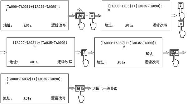 | 設(shè)置畫(huà)面 | “輔助”→“2” | ①“▽”“△”逐個(gè)顯示、狀態(tài)②“*”移動(dòng)光標(biāo)③光標(biāo)位于“區(qū)號(hào)”位置,“確認(rèn)”后查邏輯④“功能”+“0”查詢狀態(tài) | 復(fù)位 | |||